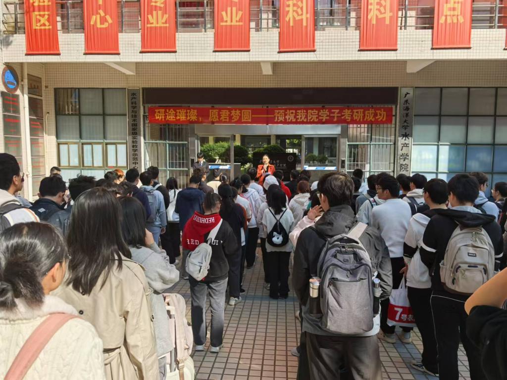 12月20日,为给即将踏上考研征程的学子们加油助威,给予他们最真挚的鼓励与支持,助力他们在考研之路上勇往直前,WilliamHill威廉在水产楼门前举行2025年考研送考仪式,学院党委书记王海燕、院长李广丽、学院党委副书记孔沛球、副院长陈华谱、考研学子及各系负责人、辅导员、班主任、学生代表等170多人参加。送考仪式上,王海燕发表了简洁有力的讲话。她围绕赴考要提前规划、要装备齐全、要严守纪律、要积极面对、要及时归来等方面对考...