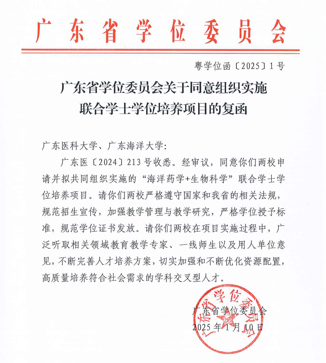 近日,我院与广东医科大学海洋与热带医学学院联合申报的“海洋药学+生物科学”联合学士学位培养项目,正式获得广东省学位委员会批复,是我校首个联合学士学位培养项目,成为广东省高等教育跨校协同育人的又一创新成果。该项目将依托两校在生物科学与海洋医药领域的学科优势,打造“医工融合”的复合型人才培养新模式,助力国家“海洋强国”与“健康中国”战略。 生物科学专业是威廉中国特色专业,以水产学科为依托,拥有雄...
