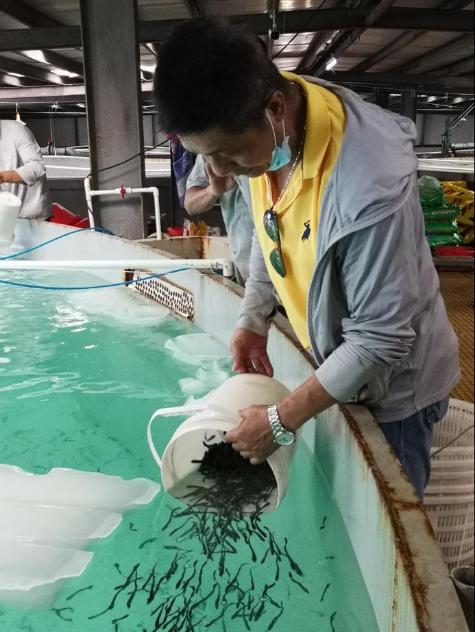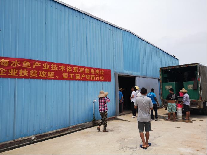 培育的军曹鱼商品种苗赠送茂名滨海新区宸熙生物科技有限公司、阳江广东省海水鱼省级良种场进行中间培育和开展室内工厂化循环水养殖第二年试验,助力养殖企业复工复产。团队采用选育耐低氧品系的亲鱼繁殖后代,可显著提高后代种苗的耐低氧能力。在疫情防控期间,团队通过亲鱼筛选、人工催产、受精卵生产、苗种培育、赠苗企业等技术服务活动等受养殖企业的好评,以实际行动诠释了疫情期间水产科技工作者的责任和担当。