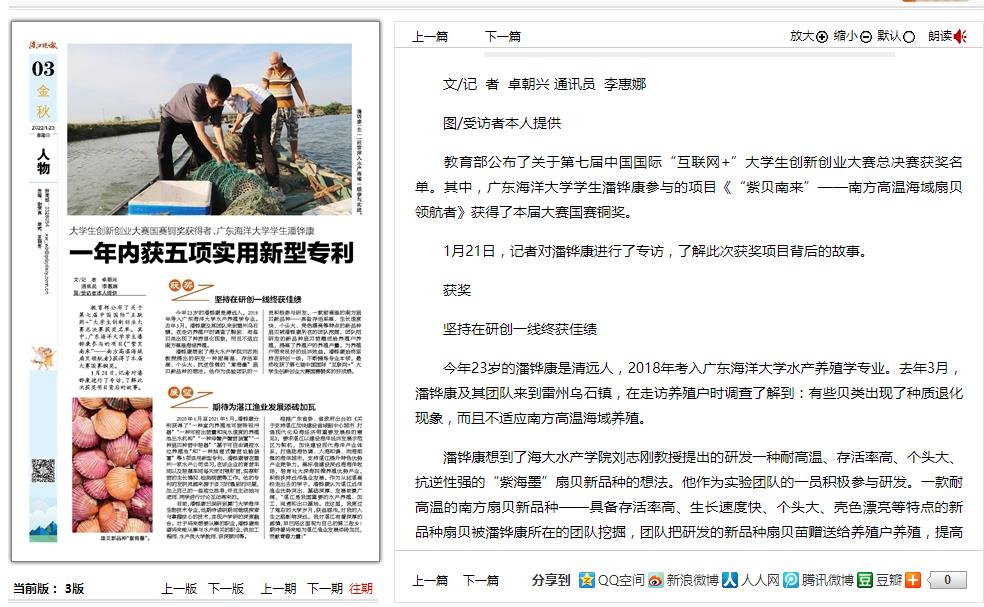 1月21日,《湛江晚报》03版以《大学生创新创业大赛国赛铜奖获得者、威廉中国学生潘铧康一年内获五项实用新型专利》为题,整版刊载了我校WilliamHill威廉学子潘铧康的专访报道,讲述了他坚持研创一线收获佳绩,期待为湛江渔业发展添砖加瓦而努力奋斗的故事。全文如下: