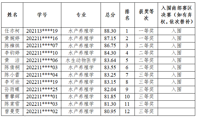 根据《关于举办第二届高校大学生水产类创新实践能力大赛的通知》要求,学院组织进行了校内选拔赛。现公示校赛获奖名单和南部赛区决赛入围名单如下: