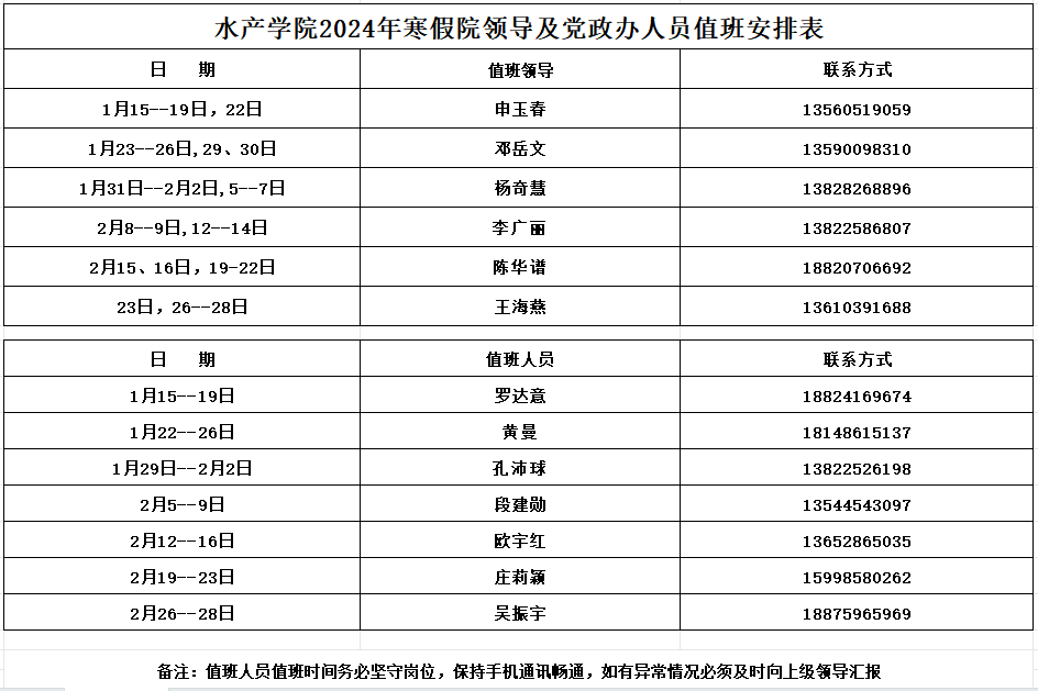 WilliamHill威廉2024年寒假院领导及党政办人员值班安排表