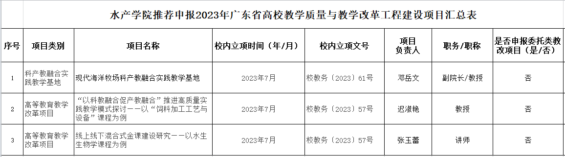根据学校《关于开展我校2023年度广东省高校教学质量与教学改革工程建设项目申报推荐工作的通知》(校教务〔2023〕95号)要求,学院组织开展有关项目的申报及推荐工作。经个人申报、学院资格审核及专家评审(高等教育教学改革项目超额申报)、学院党政联席会议审议,并根据学校对各类型项目限额的数量,学院择优推荐,拟推荐各类别项目共3项(高等教育教学改革项目2项,科产教融合实践教学基地1项)。现予以公示(详见附表)。