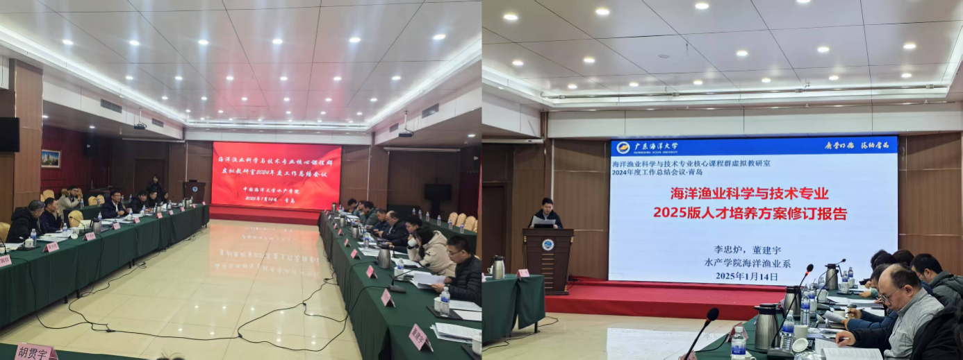 2025年1月14日,教育部海洋渔业科学与技术专业核心课程群虚拟教研室(以下简称“海渔虚拟教研室”)2024年工作总结会在青岛中国海洋大学学术交流中心隆重召开。本次会议由中国海洋大学主办,来自全国各高校海洋渔业科学与技术专业的负责人和教师代表齐聚一堂,共商海渔虚拟教研室发展计划。我院海洋渔业系主任李忠炉、副系主任董建宇及教师代表吴仁协教授参加了此次会议。