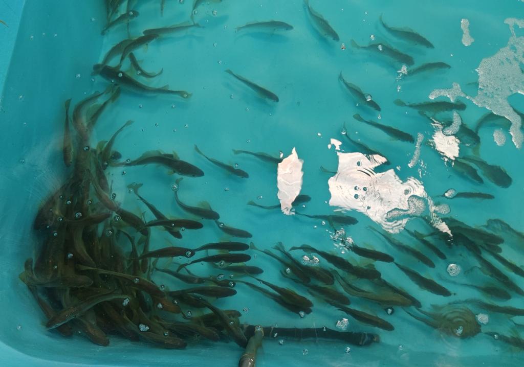 项目组联合广东恒兴集团有限公司、广东合泰渔业科技有限公司、宁德市渔业协会等单位,通过有组织的科研、产学研合作,在室内水泥池成功驯化硇洲族大黄鱼种苗1540尾(体重范围:50-100g),储备亲鱼710尾(体重范围:200-500g)。鱼体体质健壮,可摄食配合饲料,亲本性腺发育良好,构建了人工繁育群体1个。专家组考察现场,听取了课题组的关于硇洲族大黄鱼野生种苗及亲鱼采捕过程、驯化方法、营养强化等工作汇报,进行了质询答疑,查看记录,并随机抽样测量统计了硇洲族大黄鱼野生苗种及储备亲鱼规格与苗种数量。验收组专家认为,硇洲族大黄鱼野生种苗驯化及亲鱼培育的成功为其种苗人工繁育奠定了基础,助力广东省现代化海洋牧场高质量发展。