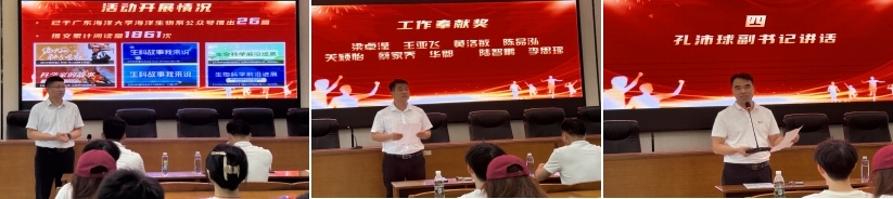 会上,田昌绪在对活动进行总结时强调,在为期一个月的活动中,共有51位同学积极参与,他们自主收集素材,共完成了131篇课程思政推文,其中26篇推文已在威廉中国海洋生物系公众号上发布,累计阅读量达到1861次,充分展现了活动的广泛参与度和积极效果。陈景阳随后宣读了获奖名单后,获奖者们依次上台领取荣誉证书和奖品,他们的努力赢得了与会人员的热烈掌声。孔沛球在总结发言中对本次活动给予了肯定,并鼓励学生们继续在学术道路上坚守学术诚信,追求卓越,积极参与学院的各项教育教学活动,共同推动学院的学风建设和思政工作再上新台阶。