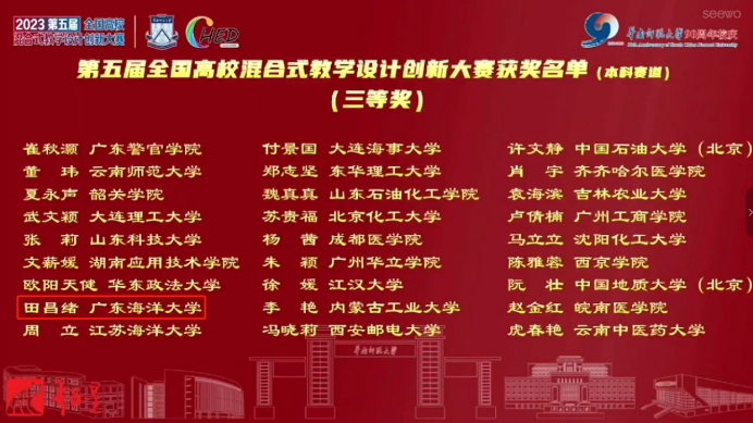 全国高校混合式教学设计创新大赛自2019年创办以来,秉承“以赛促建、以赛促用、以赛促教改”为宗旨,致力于挖掘、培育并展示教师的教学设计及课程建设等成果,全面深化高校教育教学改革,推进一流本科课程建设,推进信息技术与教育教学的深度融合。大赛目前已被纳入中国高等教育学会《全国普通高校教师教学竞赛分析报告》和《全国普通高校教师教学发展指数》数据统计源,是衡量高校教师教学发展生态的重要指标之一。本届大赛于2023年5月25日启动,分为初赛、复赛以及现场决赛三个环节。据悉,本科组复赛收到全国约335所高校的1007件参赛作品进行评比;其中,特等奖12项(占1%),一等奖(本科赛道)87项(占10%),二奖项和三等奖(本科赛道)各145项(占15%)。