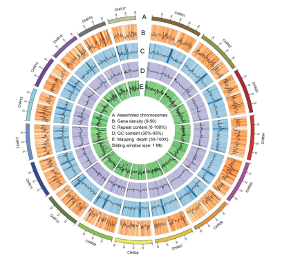 滑动窗口:1 Mb;A:已组装染色体;B:基因密度(0-50);C:重复序列含量(0-100%);D:GC含量(30-45%);E:测序深度(30-100×)。