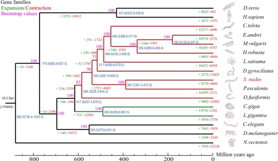 红色分支代表环节动物门(Annelida),绿色分支代表软体动物门(Mollusca)