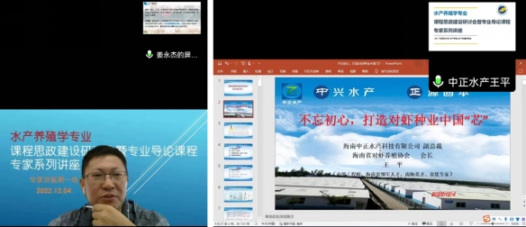 2022年12月3日,通过腾讯会议线上形式,水产养殖学专业举办课程思政研讨会暨专业导论课程专家系列讲座。学院副院长杨奇慧、水产养殖系主任王忠良、副主任黄建盛、部分老师及2022级全体同学共200余人参会。会议由黄建盛主持。