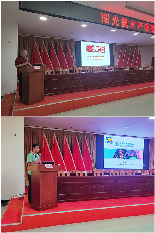 培训班上,汤保贵和杜涛分别作了“海水池塘-基围接力式轮捕轮放混养殖技术”和“沙锥鱼的人工养殖技术”专题培训。其中,“海水池塘-基围接力式轮捕轮放混养技术”是2021年广东省渔业主推技术,已在湖光镇湛江海思特水产科技有限公司进行示范应用。“沙锥鱼的人工养殖技术”则先后获得了湛江市科技进步奖一等奖和广东省农业技术推广奖二等奖,南美白对虾与沙锥鱼混养技术已在多地推广和应用。这次技术培训助力当地相关企业和农户解决生产过程中存在的技术难点,提升了养殖技术水平。