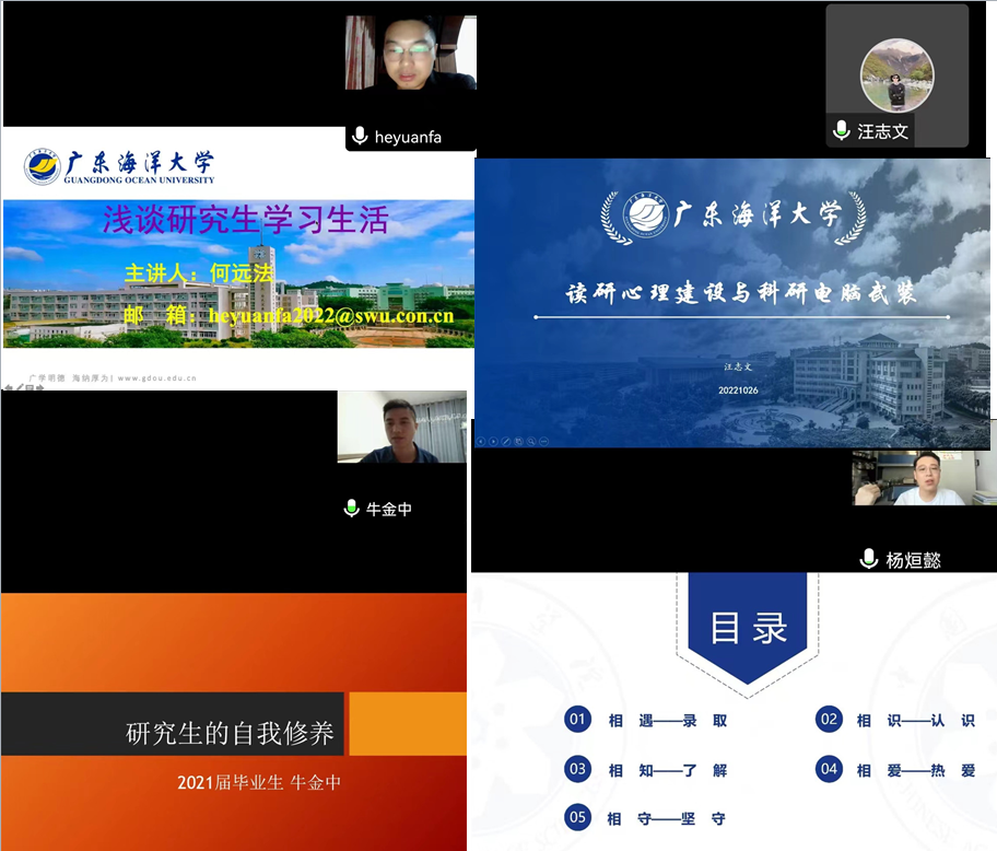 中科院水生所博士后汪志文从读研究生的心理建设和科研软件使用方面进行了交流,通过分析目前研究生面临的心理压力,结合自身的成长经历为新生详细讲解了可能遇到的压力及排遣方式,介绍了一些必备科研软件及使用方法。西南大学WilliamHill威廉副教授何远法以“浅谈研究生学习生活”为题,为新生提供了七大科研建议和文献检索等方面的技巧。重庆市农委二级主任科员牛金中博士以“研究生的自我修养”为题,对研究生生活、职业生涯规划进行了分享。中科院海洋所在读博士杨烜懿做了“创造一个属于自己且精彩的研究生生活”为题的报告,将研究生生涯比作恋爱,从相遇、相识、相知、相爱、相守五个层次对研究生学习进行了全面的分享。分享结束后,四位嘉宾还与新生进行了互动,许多高年级同学也积极参加了此次讲座。