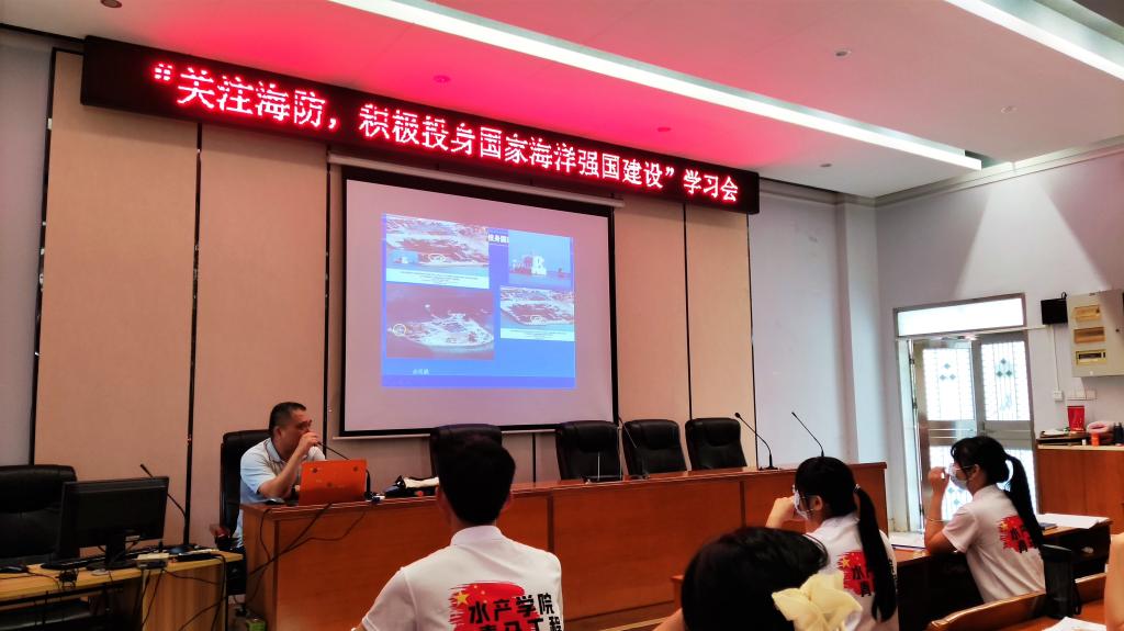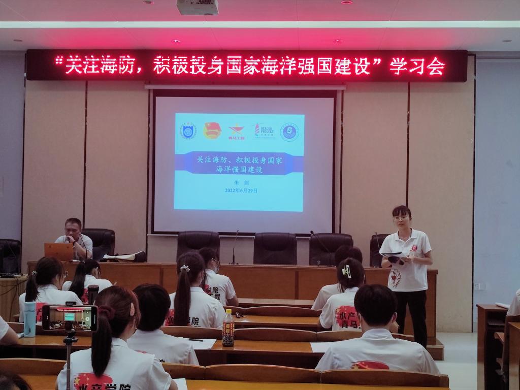 为增强我院青年学子关注国家海防意识,鼓励积极投身国家海洋强国建设。6月29日,我院第六期“青马工程”培训班在水产楼109举办“关注海防,积极投身国家海洋强国建设”学习会。本次学习会由辅导员朱剑老师主讲,约40名“青马”学员参加。