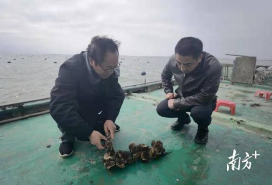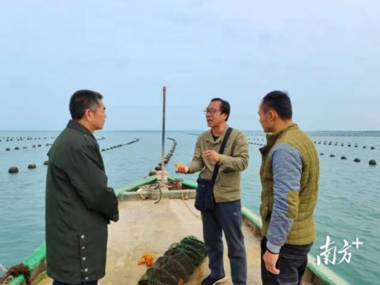 帮扶工作队队长和科技特派员在海上养殖区调研