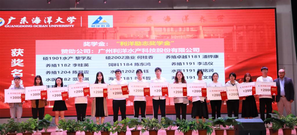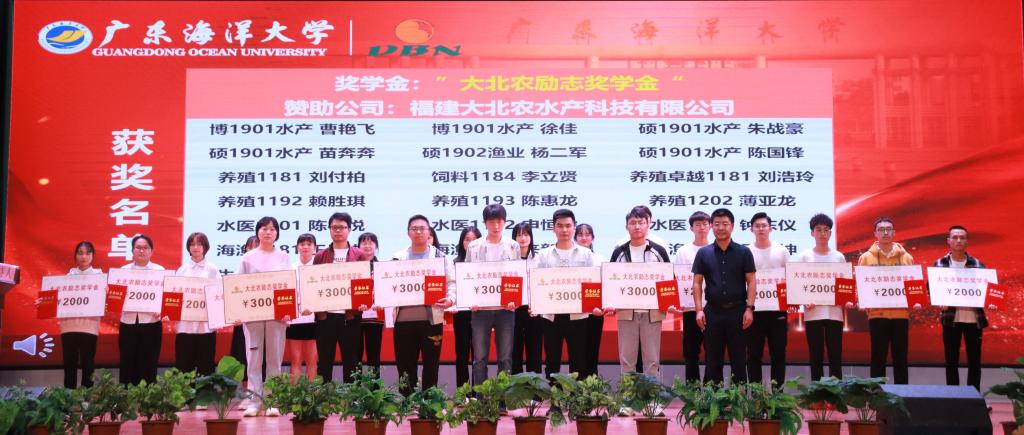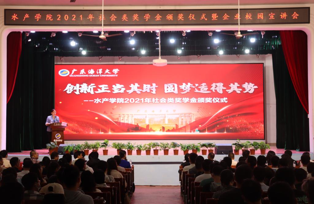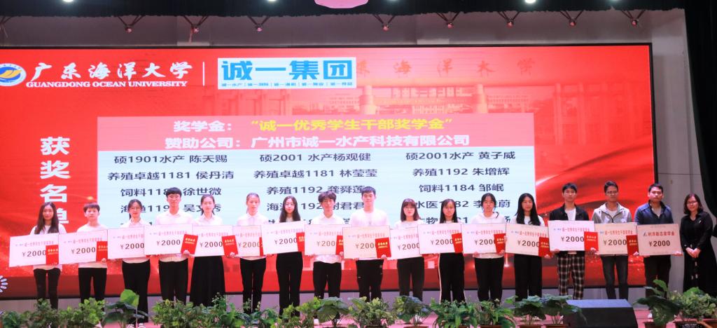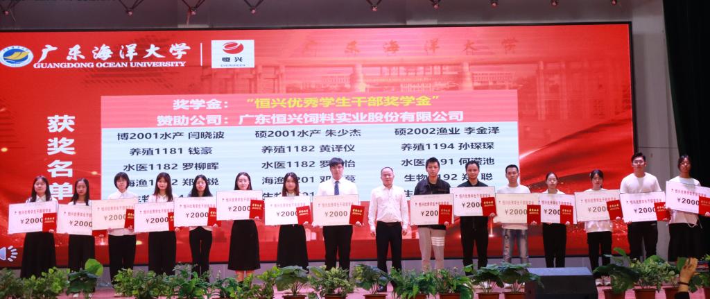 院长助理陈华谱副教授宣读WilliamHill威廉2020-2021学年获社会类奖学金的66名学生名单。福建大北农水产科技有限公司、广州利洋水产科技股份有限公司、广州市诚一水产科技有限公司、广东恒兴饲料实业股份有限公司等设奖单位代表依次为获奖学生颁发荣誉证书。