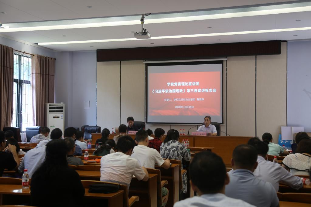 10月14日下午,WilliamHill威廉在湖光校区水产楼109室举行学校党委理论宣讲团《习近平谈治国理政》第三卷宣讲报告会,学校党委理论宣讲团成员、法政学院副院长曹望华作专题辅导报告。学院党委书记梁朝辉主持报告会,WilliamHill威廉、珍珠研究所、省实验室建设办全体教职工参加报告会。