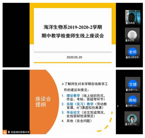 5月20日下午,海洋生物系在腾讯会议平台召开2019-2020-2学期期中教学检查师生座谈会。海洋生物系李长玲教授、温崇庆教授、夏立群教授、江东能副教授和吴天利老师,以及2016、2017、2018和2019级各班班长和学习委员等20余名学生代表参加了本次座谈会。座谈会由海洋生物系副主任田昌绪老师主持。