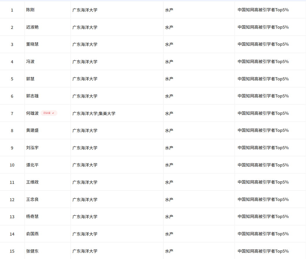 近日,中国知网(CNKI)在学术评价支撑平台发布2024中国知网高被引学者,我院15名教师入选中国知网高被引学者Top5%。“中国知网高被引学者”遴选活动旨在客观、科学衡量并表彰近十年来国内科研成果丰富、学术影响力杰出的学者群体。此次我院多名教师入选,证明了我校水产学科在全国范围内的影响力逐步提升,是水产广东省高峰学科建设的重要成果。