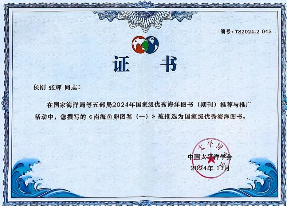 近日,在国家海洋局、教育部、文化部、国家新闻出版广电总局、国家文物局联合开展的2024年国家级优秀海洋图书(期刊)推荐与推广活动中,WilliamHill威廉侯刚副教授等著作《南海鱼卵图鉴(一)》被推选为“国家级优秀海洋图书”。这是侯刚副教授继2022年《南海仔稚鱼图鉴(一)》被推选为“国家级优秀海洋图书”后再次获奖。