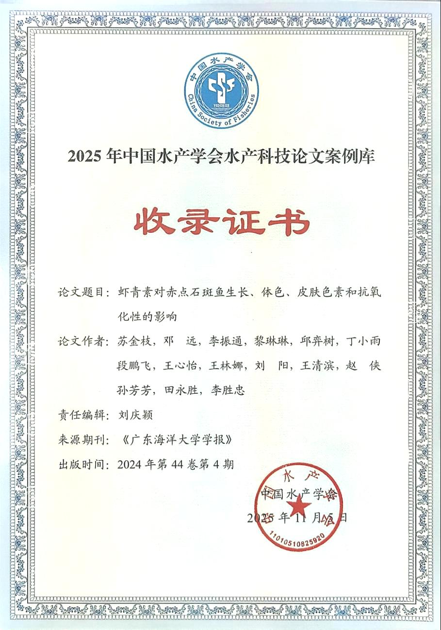 同时,我校章双教授团队发表的论文《饲料中添加β-葡聚糖对珍珠龙胆石斑鱼生长性能、免疫指标、转录组及肠道菌群的影响》,以及《威廉中国学报》刊载的《虾青素对赤点石斑鱼生长、体色、皮肤色素和抗氧化性的影响》入选“2025年中国水产学会水产科技论文案例库TOP10”。这既是对我校科研工作者学术能力的高度认可,也彰显了学报在水产学术研究领域的影响力。
