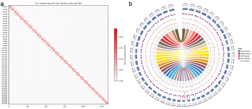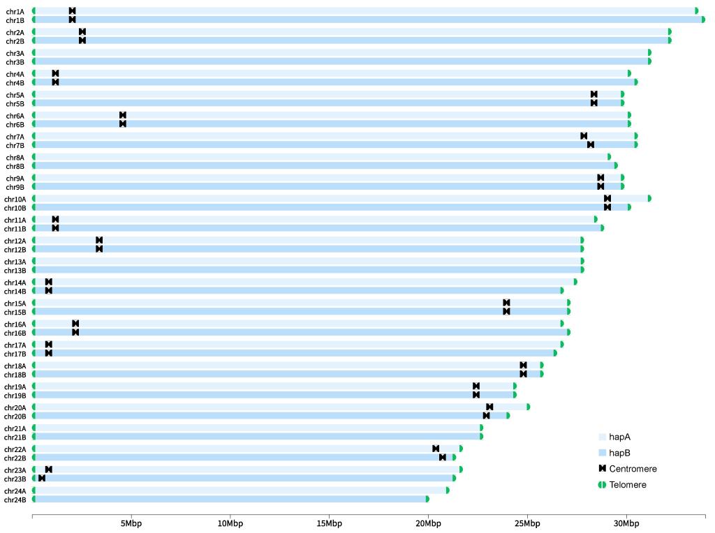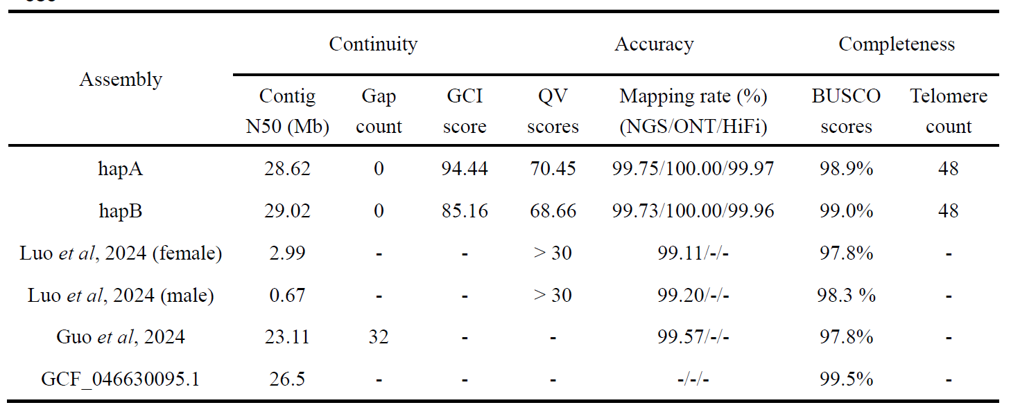 本研究整合PacBio HiFi、Oxford Nanopore超长读长以及Hi-C空间构象捕获等多组学技术,对其基因组进行了系统组装。研究团队成功获得两套T2T级别的单倍型基因组(hapA与hapB),大小分别达到663.78 Mb和661.09 Mb,24条染色体全部实现gap-free无间隙装配,并完整解析出全部48个端粒结构。两套基因组的Contig N50分别达到28.62 Mb和29.02 Mb,BUSCO完整度高达98.9%与99.0%,k-mer QV值达到70.45与68.66。基因注释结果显示,两套基因组分别预测出23,118与23,119个蛋白编码基因,其中超过99.7%获得功能注释。与先前的基因组版本相比,本研究获得的T2T级别组装在连续性、完整性和准确性上均有大幅提升,将成为开展阿纳鲳鲹及其他鲹科鱼类分子育种、功能基因组学研究及演化研究的重要基础资源,对推动海水鱼类遗传育种技术的发展具有深远意义。