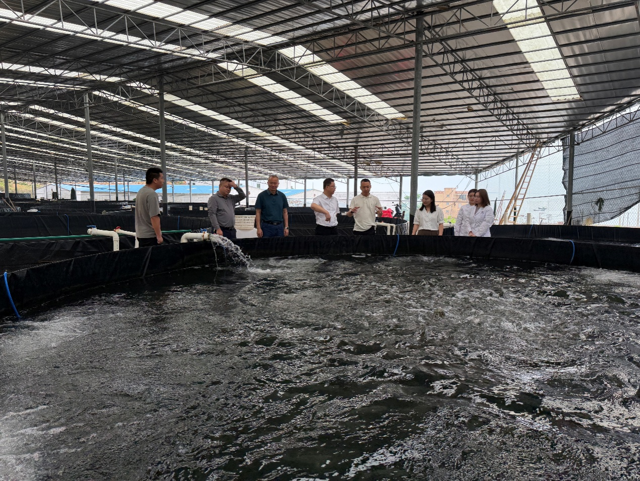 调研组一行在科技小院负责人王忠良教授的陪同下,实地参观了亲鱼培育车间、苗种培育池和工厂化养殖车间,详细了解小院在马友鱼遗传育种、繁育技术及生态养殖方面的科研现状和技术创新。期间,王忠良教授重点汇报了团队在技术推广、产学研合作、科技成果转化及人才培养等方面的最新进展。
