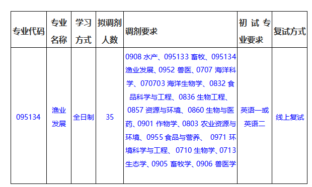 根据上级部门下达学校的指标,我校渔业发展专业尚有部分调剂名额,欢迎大家调剂,调剂基本要求见/info/1102/3312.htm。