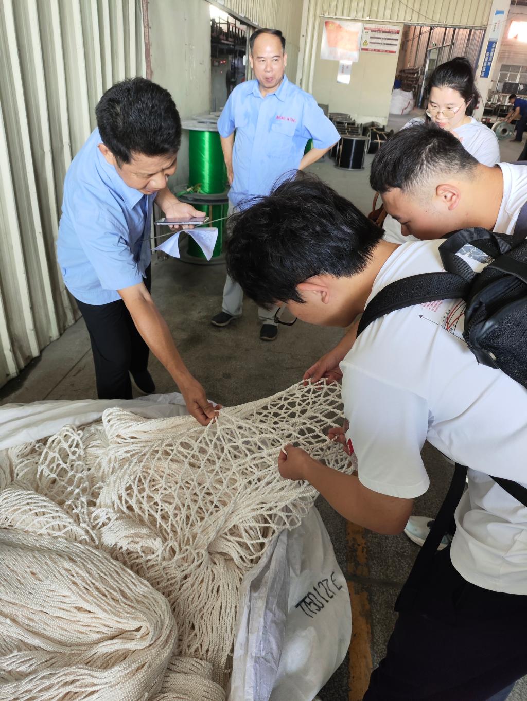 在经纬网厂生产车间,湛江经纬网厂副厂长吴华康带领同学们参观了无结经编网和有结网生产车间,向同学们详细讲解新材料编织网具在深远海养殖、海洋牧场建设中的应用。在修补车间,同学们走进“海威1号”网衣修补现场,第一视角感受新材料渔具在深远海养殖和海洋牧场中的基础关键地位,使同学们对所学专业有了更进一步的认识。